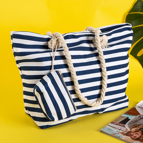 Tmavě modrá plážová taška s bílými pruhy se sáčkem - kabelky