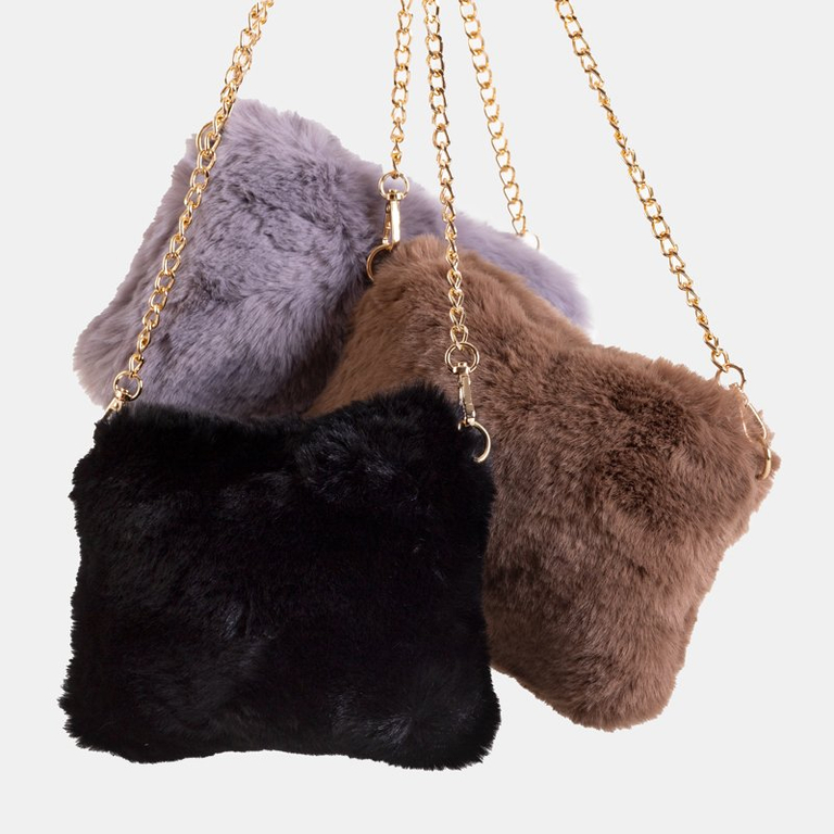 - Módní dámská kabelka na zlatém řetízku připevněná na sponě na humra. Materiál je potažen syntetickou kožešinou, zapínání formou zipu. Jedna přihrádka uvnitř, žádné další kapsy. Ideální pro elegantní a večerní outfity!
