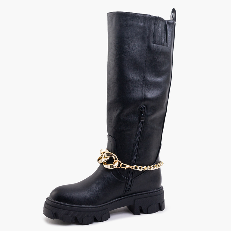 - Klasické dámské kozačky po kolena z ekologické kůže. Ve výšce kotníků model zdobí odnímatelný popruh s plastovým řetízkem zlaté barvy. Boty se zapínají na zip, uvnitř je hřejivý v podobě jemné kožešiny.