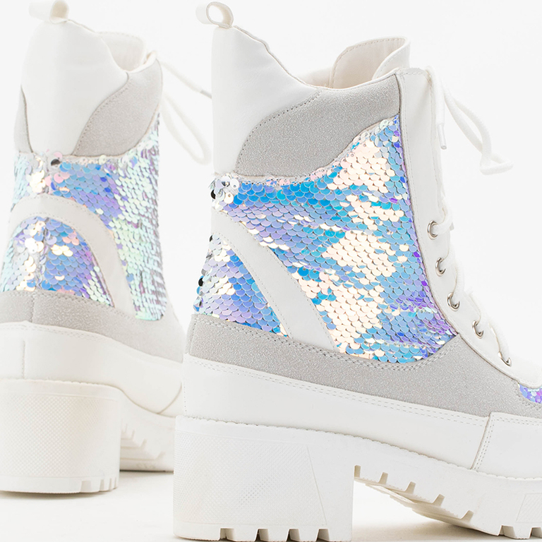 • Dámské pracovní boty, vyrobené z kombinace ekokůže a eko semiše. Šněrovaný svršek pokrytý holografickými flitry. Střed boty je zateplen jemnou kožešinou, gumovou podrážkou. Perfektní dámská obuv pro podzimní sezónu!