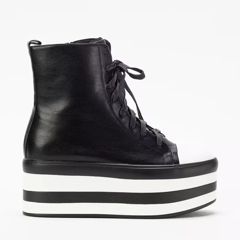 - Jedinečné dámské kozačky na vysoké platformě, vyrobené z ekologické kůže. Model je šněrovaný a má zapínání na zip na boku, uprostřed látkovou vsadku. Poznámka: výrobek má na materiálu stopy lepidla.