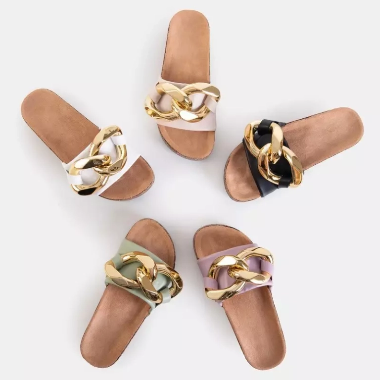 - Fantastické dámské pantofle zdobené velkým zlatým řetízkem. Pásek je vyroben z ekologické kůže, stélka z eko-semišové kůže. Ideální pro vytváření trendy letních outfitů! Poznámka: výrobek má škrábance na materiálu.