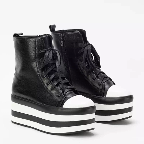 - Jedinečné dámské kozačky na vysoké platformě, vyrobené z ekologické kůže. Model je šněrovaný a má na boku zip, uprostřed látkovou vsadku. Poznámka: Produkt má změnu barvy na materiálu.