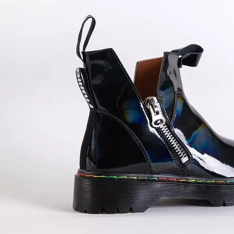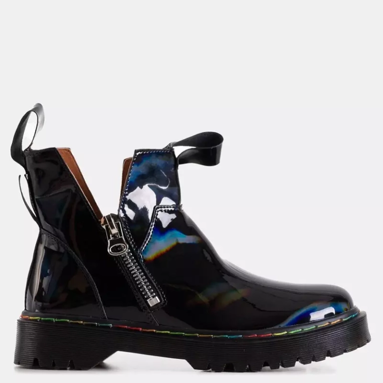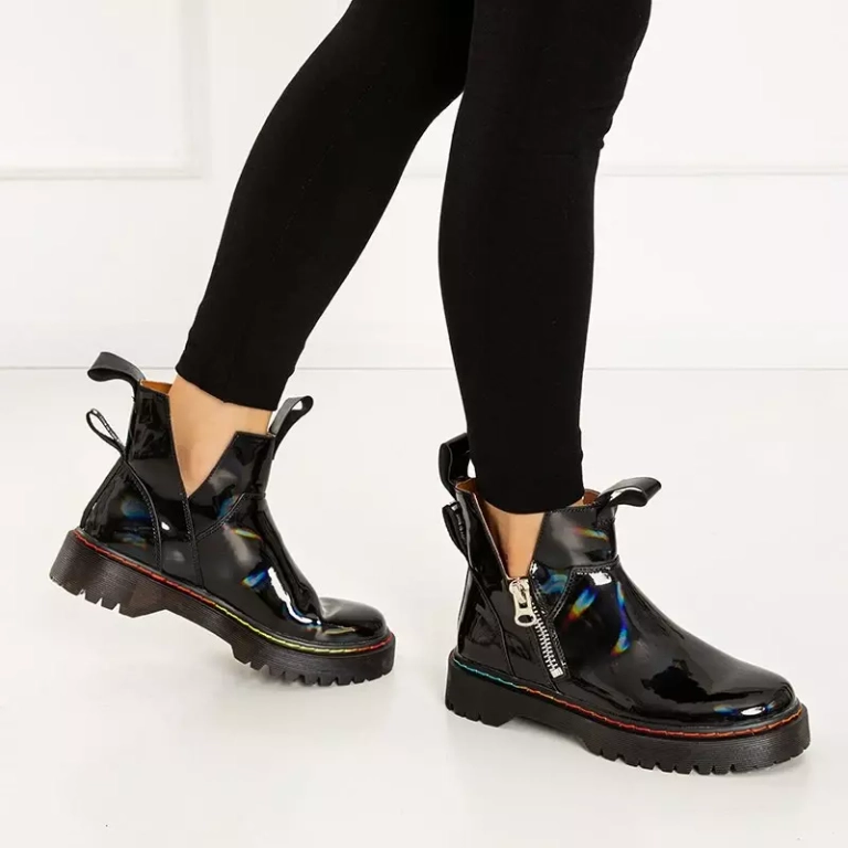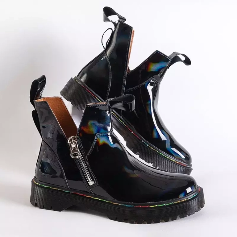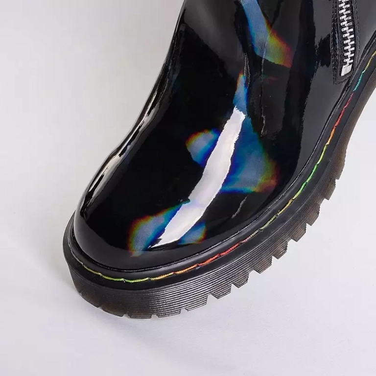 - Dámské kozačky z kombinace gumového materiálu a ekokůže s holografickým motivem. Model bez zateplení, stélka uvnitř je podšitá ekokůží. Výřezy na boku a zapínání na zip. Poznámka: výrobek má zlomený materiál.