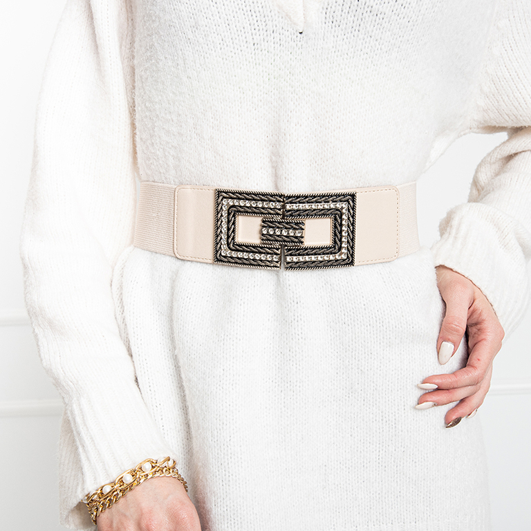 Dámský béžový elastický pásek se stříbrnou sponou s kubickou zirkony - Doplňky