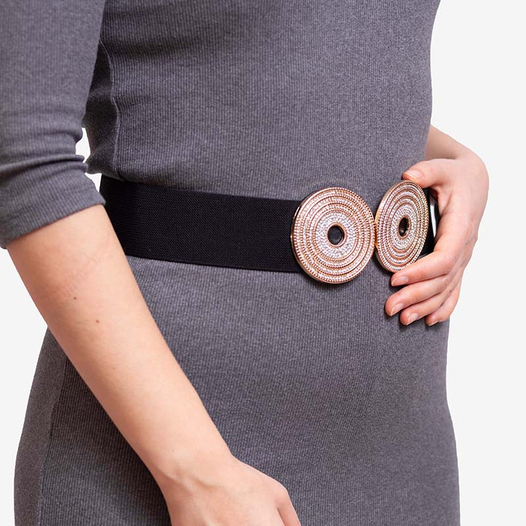 - Skvělý široký dámský pásek se zlatou sponou s kubickou zirkony. Model je vyroben z kombinace ekologické kůže a pryže. Tento nápadný model se perfektně hodí k šatům i kalhotám.