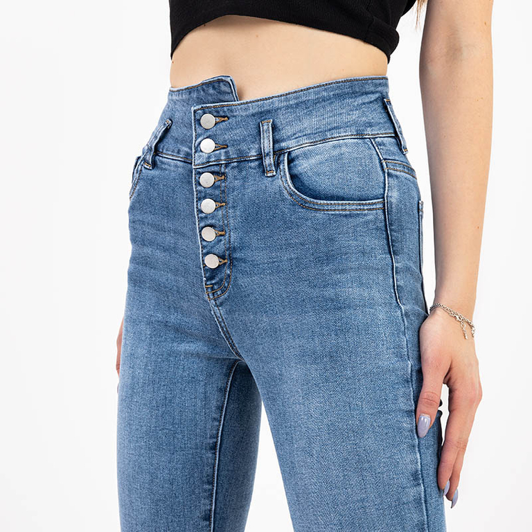 - Univerzální úzké džíny vyrobené z bavlněné tkaniny. Model s vysokým pasem a knoflíky. Dva páry kapes - na zadní a přední straně. Džíny se hodí k mnoha outfitům! POZNÁMKA: Přesnost měření (+/-) 1 cm.