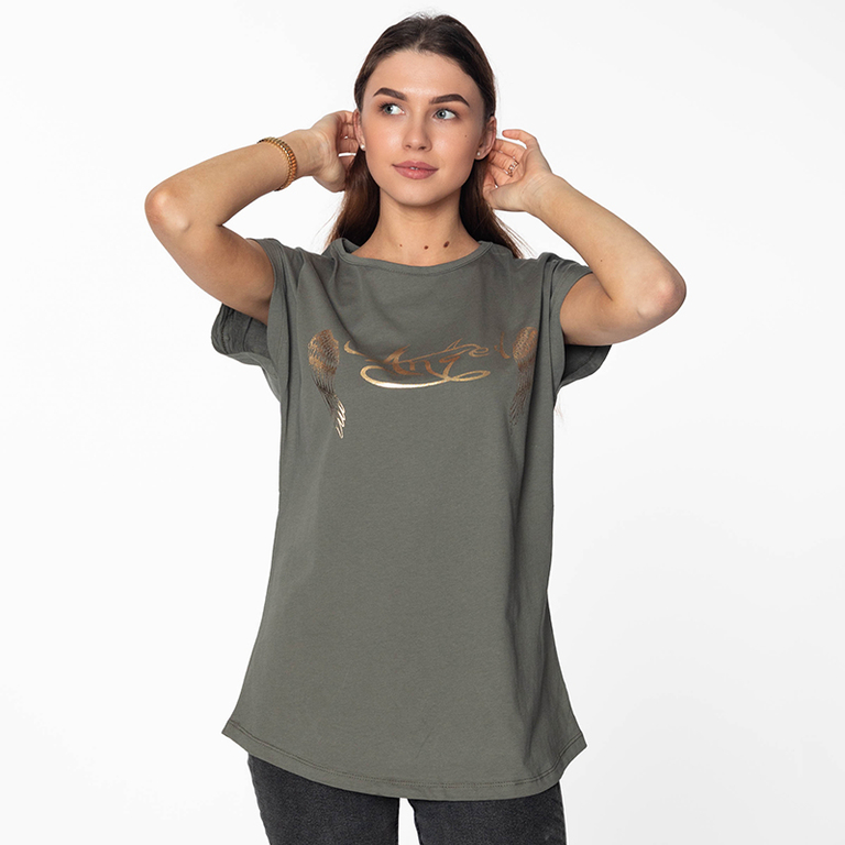 Dámské tričko se zlatým potiskem a khaki nápisem - Oblečení