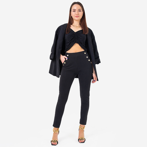 • Elegantní černé dámské treginy, vyrobené z elastického materiálu. Kalhoty s elastickým pasem a ozdobnými knoflíky na dvou předních kapsách. Budou skvělé ke košili! POZNÁMKA: Přesnost měření (+/-) 1 cm.