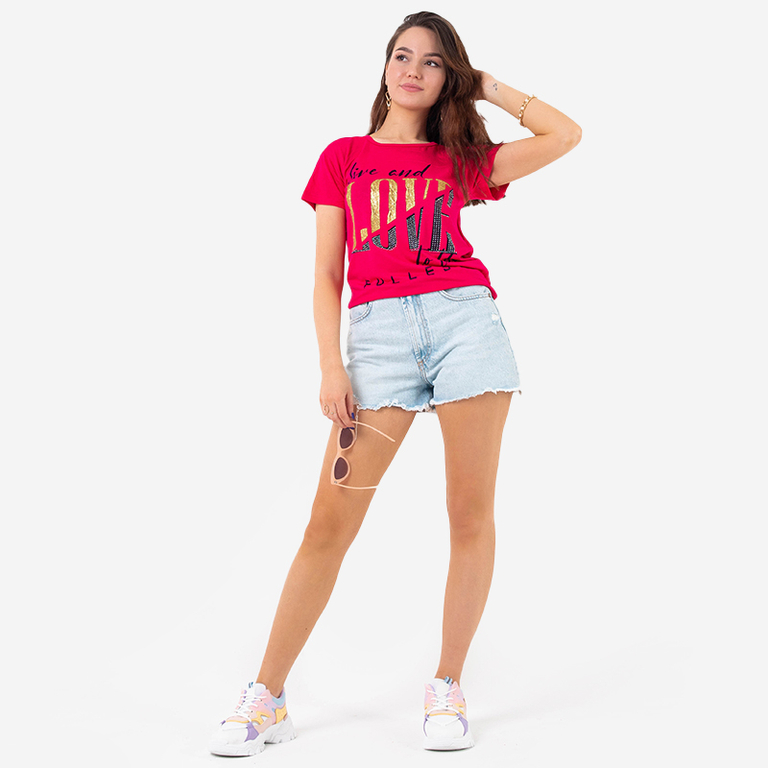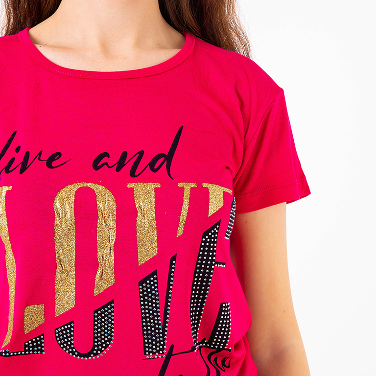 Fuchsiové dámské tričko s nápisy zdobené třpytem a kubickou zirkonií - Oblečení