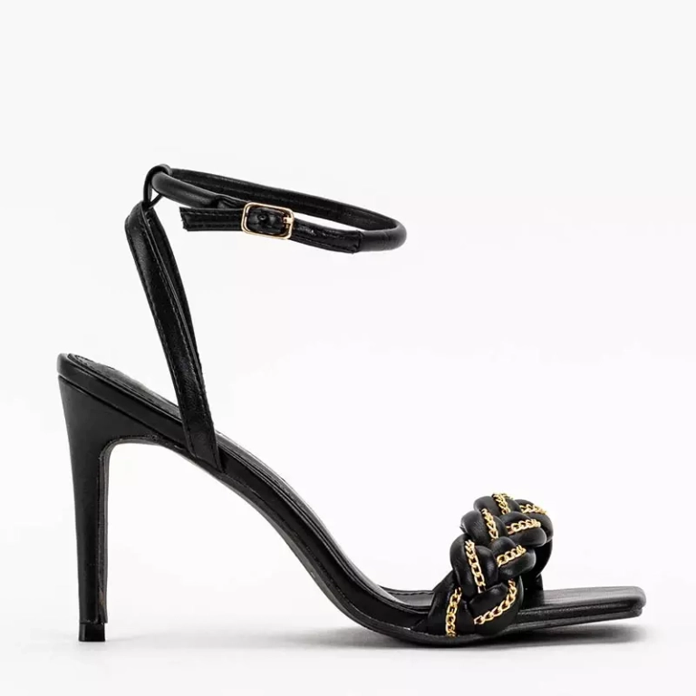 - Krásné dámské sandály na vysokém podpatku, zdobené zlatým řetízkem. Celý pár je vyroben z ekologické kůže. Kolem kotníku je nastavitelný pásek se zapínáním na přezku. Poznámka: výrobek má škrábance na materiálu.