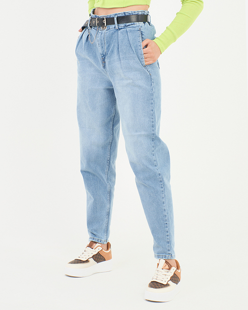 - Stylové dámské mom jeans, vyrobené z bavlněného materiálu. Model má: - vysoký pas, - zapínání na knoflík a zip, - 4 kapsy, - pásek 100 cm dlouhý a 3 cm široký POZNÁMKA: Přesnost měření (+/-) 1 cm.