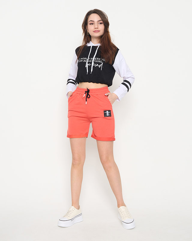 - Dámské sportovní šortky nad kolena, zdobené nášivkou. Model má 2 kapsy, elastický pas a stahovací šňůrky. Velmi pohodlné kraťasy, které se budou skvěle hodit ke sportovní obuvi! POZNÁMKA: Přesnost měření (+/-) 1 cm.