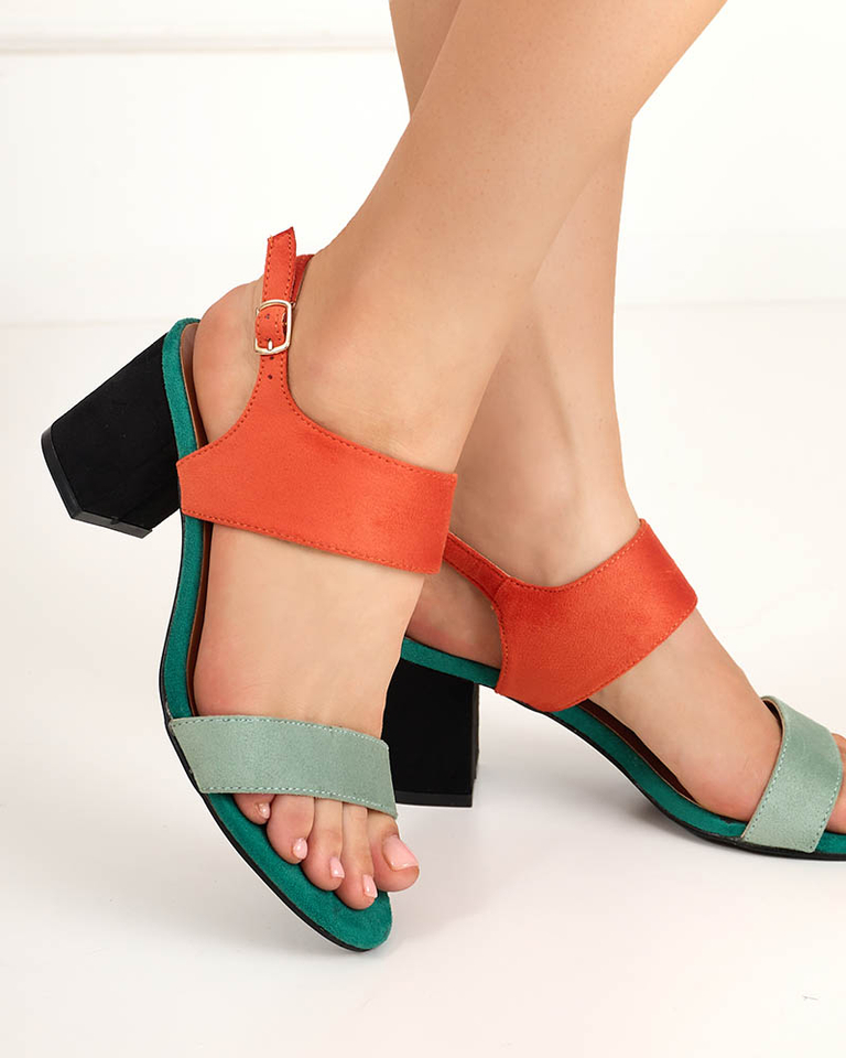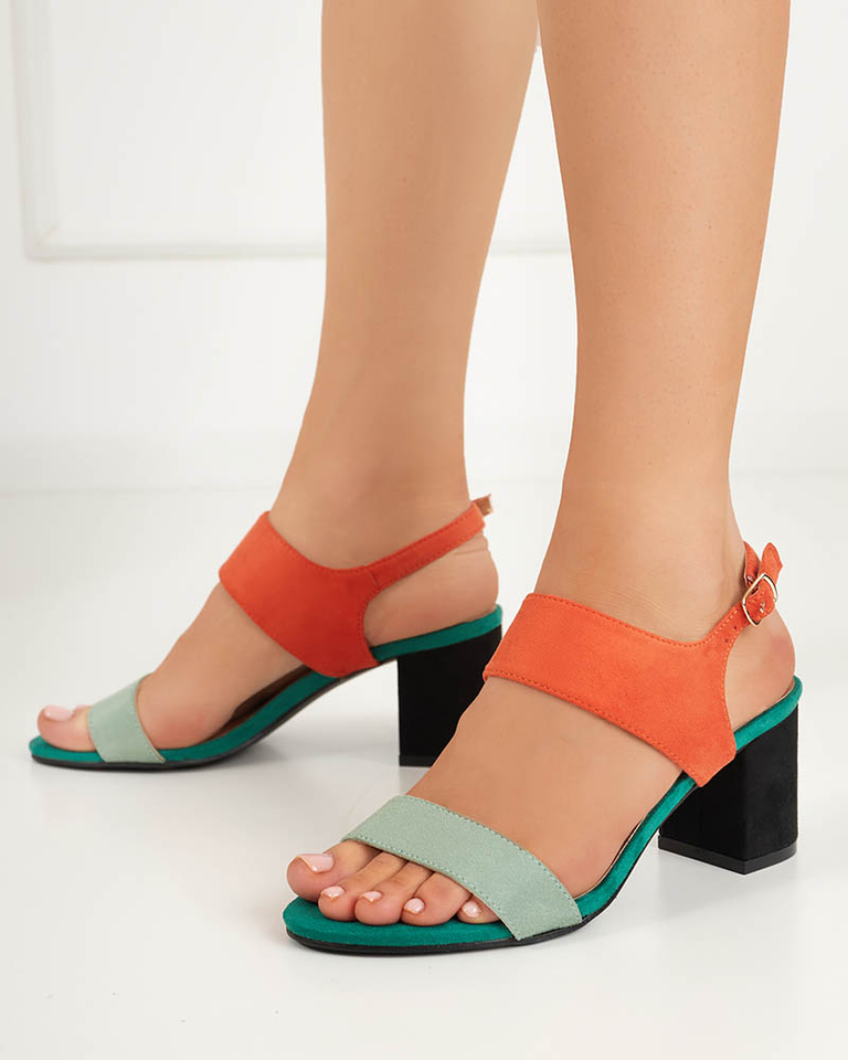 • Klasické dámské sandály na sloupku vyrobené z ekologické semišové kůže. Model má zajímavé barevné provedení. Výrobek se zapíná na přezku v úrovni kotníku, má stélku z ekologické kůže.