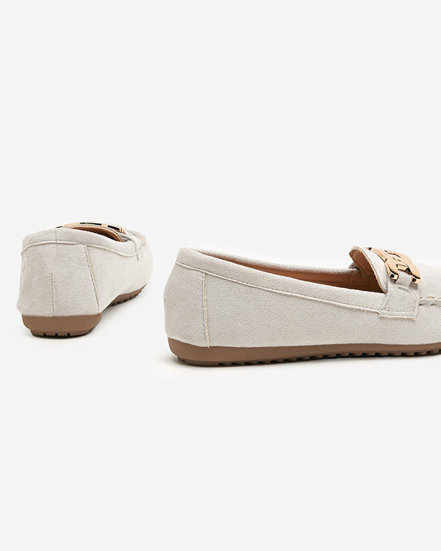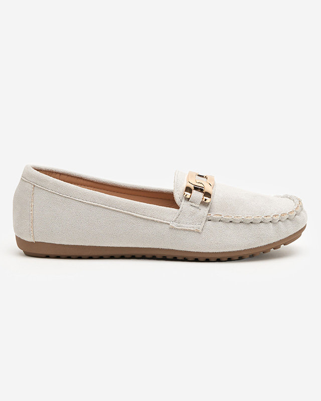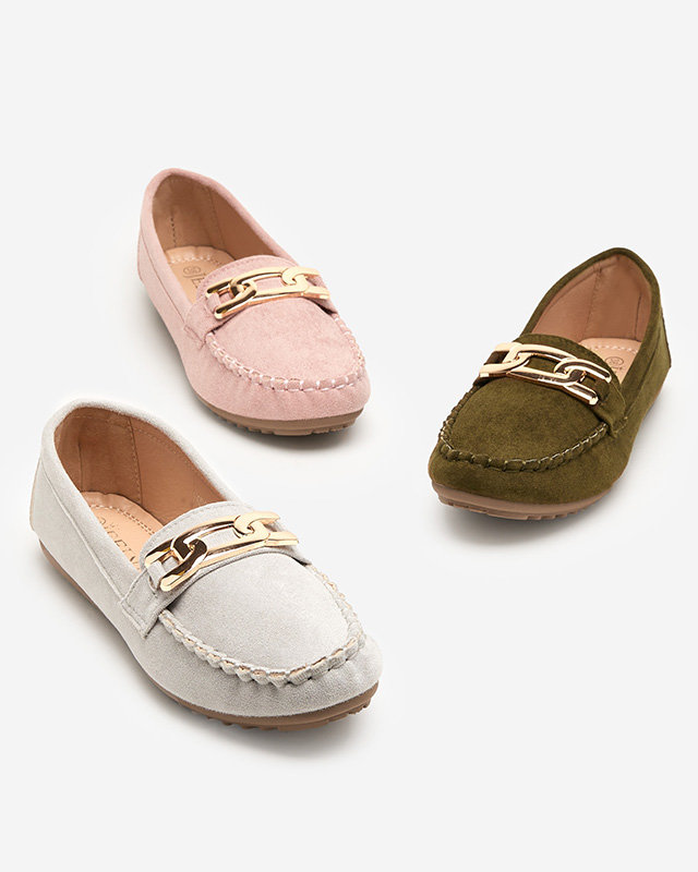 • Klasické dámské mokasíny s kovovým zdobením na špičce. Svršek je vyroben z ekokůže semiš, měkká stélka je vyrobena z ekokůže. Poznámka: výrobek má na materiálu stopy lepidla.