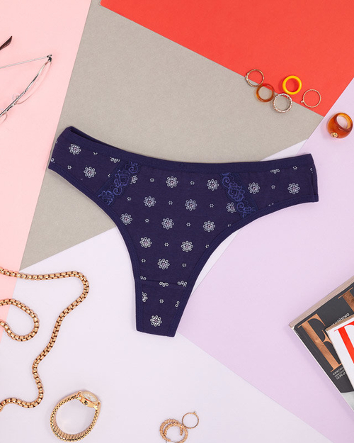 Námořnická modrá dámská bavlněná tanga s květinami - Spodní prádlo
