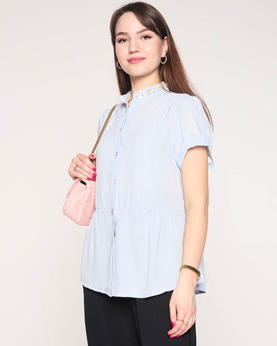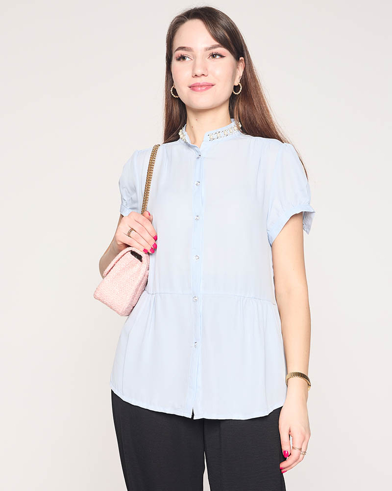 - Košilová halenka ze vzdušné tenké látky. Model s krátkým rukávem, límečkem s perlami a kubickými zirkony a zapínáním na knoflík. Ideální pro vytváření módních a originálních outfitů! POZNÁMKA: Přesnost měření (+/-) 1 cm.