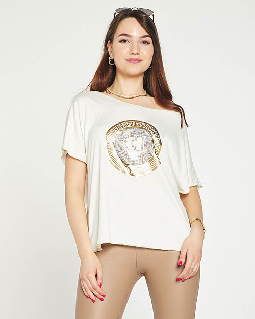 • Módní dámské tričko se zlatým potiskem zdobeným kubickou zirkonií. Vyrobeno z tenké, měkké a elastické bavlněné tkaniny. Výstřih a okraje zdobené zlatou nití. Perfektní základ pro mnoho každodenních looků! POZNÁMKA: Přesnost měření (+/-) 1 cm.