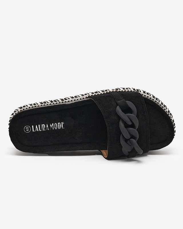 - Klasické dámské pantofle na zdobené vyšší a silnější podrážce z pryžového materiálu. Vložka je vyrobena z eko semiše, pásek je rovněž z eko semiše s řetízkovou ozdobou. Skvělé na dovolenou! Poznámka: výrobek má škrábance na materiálu.