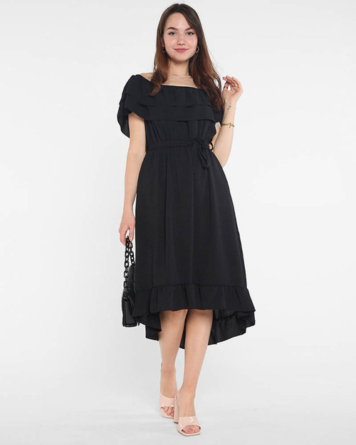 - Krásné dámské lehké letní šaty s volánky a symetrickým lemem. Výrobek s krytými rameny á la španělština, má gumu a zavazování v pase. Dokonalý základ mnoha letních outfitů! Přesnost měření (+/-) 1 cm.