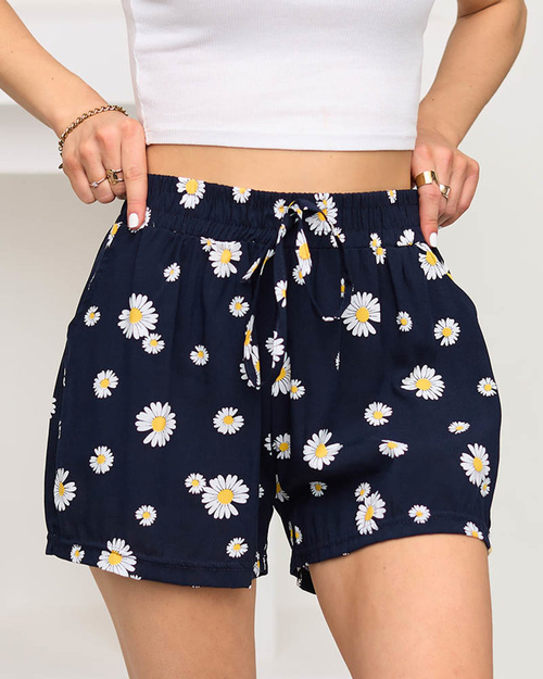 - Velmi pohodlné kraťasy s krásnými květy, vyrobené z materiálu s vysokým obsahem bavlny. Model s kapsami, gumou a šňůrkami v pase. POZNÁMKA: přesnost měření (+/-) 1 cm.