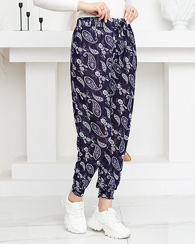 - Pohodlné, vzorované dámské volné kalhoty z lehké tkaniny. Model má elastický pas, spodní část nohavic a dvě kapsy. Ideální na léto! POZNÁMKA: Přesnost měření (+/-) 1 cm.