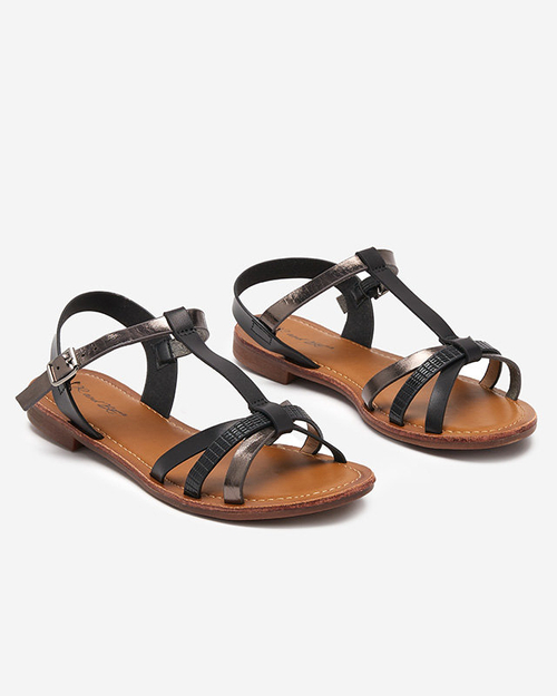 • Klasické dámské sandály na ploché podrážce, svršek z ekologické kůže s lesklým proužkem. Model se zapíná na přezku z vnější strany.