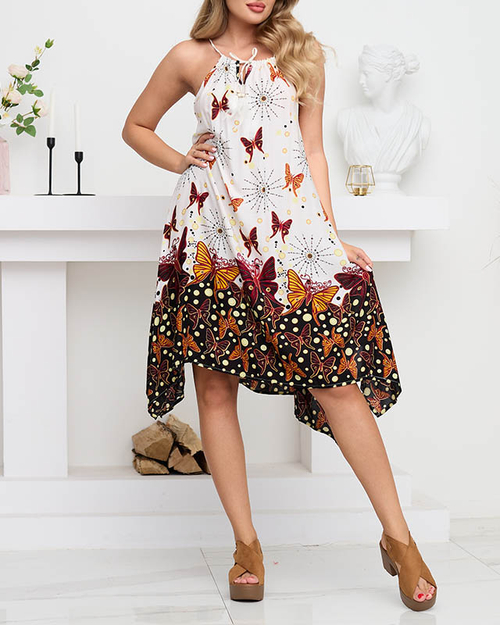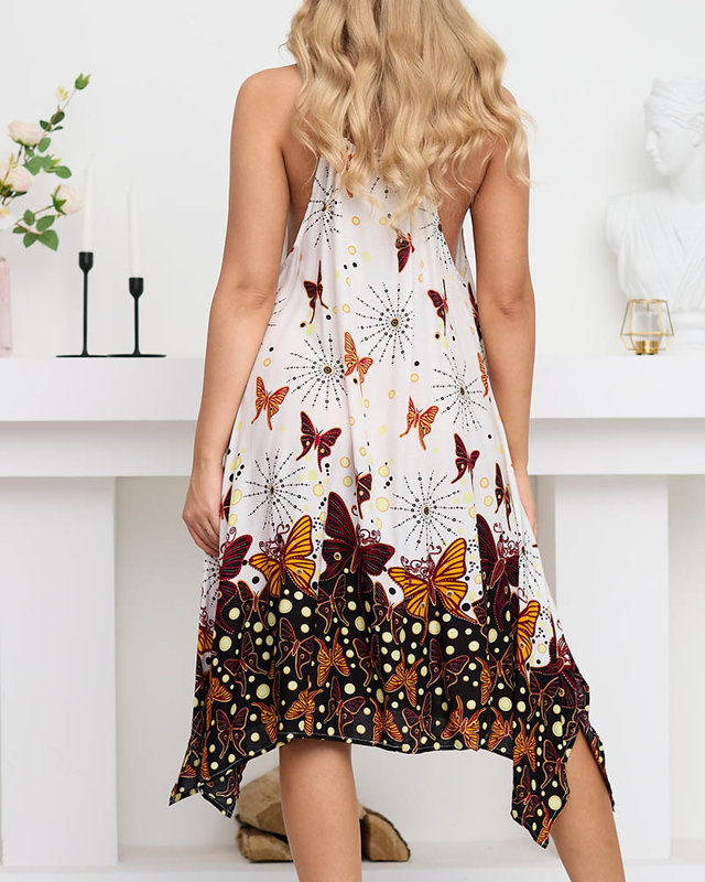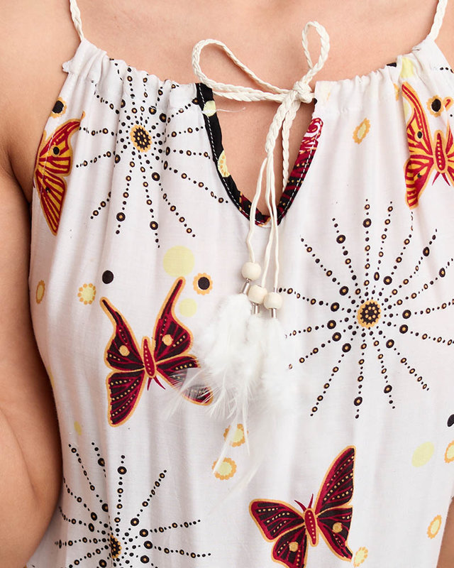 - Originální letní dámské šaty ke kolenům s motýlky, s ramínky. Model má rozšířený spodek a delší na bocích a unikátní zavazování u kulatého výstřihu v podobě šňůrky s peříčky. POZNÁMKA: Přesnost měření (+/-) 1 cm.