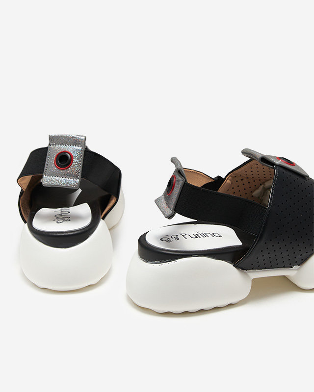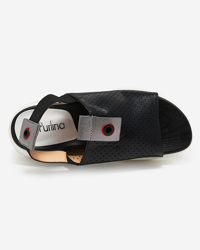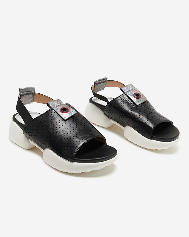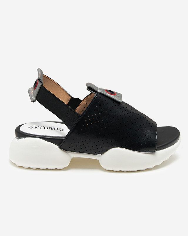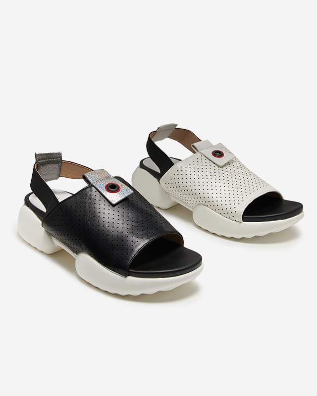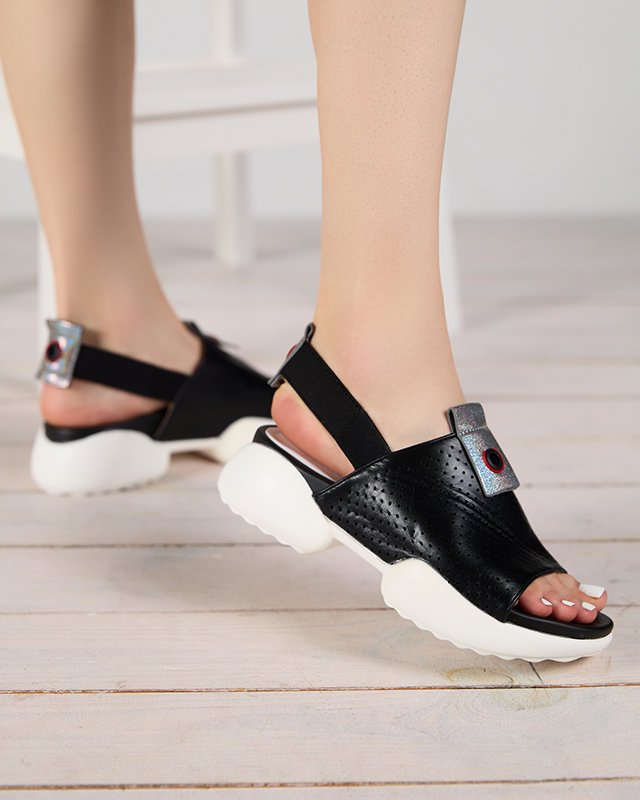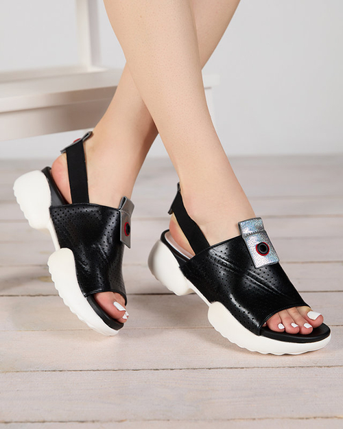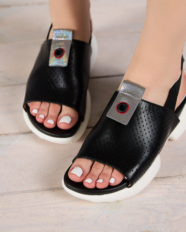 - Dámské sandály ve sportovním stylu, vyrobené z ekologické kůže. Prolamovaný svršek, stélka z ekokůže, zadní pásek se jemně natahuje. Podrážka je gumová, navíc třpytivé vsadky na svršku a pásku. Skvělé na léto!