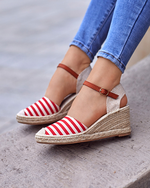- Krásné dámské sandály a'la espadrilky na klínku, vyrobené z látky s pruhy. Model se zapíná na přezku kolem kotníku. Podešev je zdobena pletenou jutovou šňůrou. Ideální k letním outfitům!