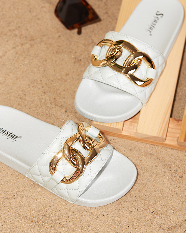 - Nejmódnější dámské pantofle letošní sezóny z prošívané ekologické kůže. Model zdobí velký plastový řetízek ve zlaté barvě. Stélka a podešev jsou vyrobeny z gumy. Poznámka: Produkt má změnu barvy na materiálu.
