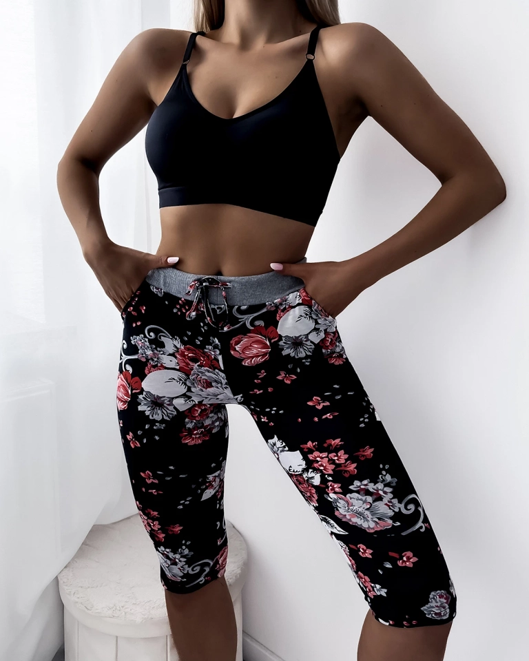 - Pohodlné dámské 3/4 kraťasy s kapsami, z bavlněné látky s květinami. Model má v pase gumu a uzlované válečky. POZNÁMKA: Přesnost měření (+/-) 1 cm.