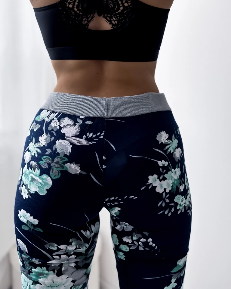 Dámské 3/4 tmavě modré kraťasy se zelenými květy PLUS SIZE - Oblečení