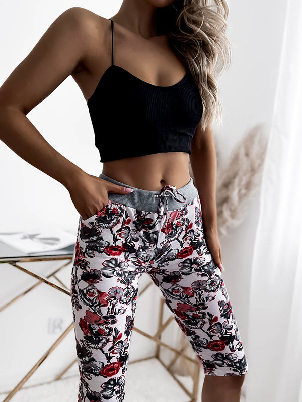 • Pohodlné dámské 3/4 kraťasy s kapsami, z bavlněné látky s květinami. Model má v pase gumu a uzlované válečky. POZNÁMKA: Přesnost měření (+/-) 1 cm.