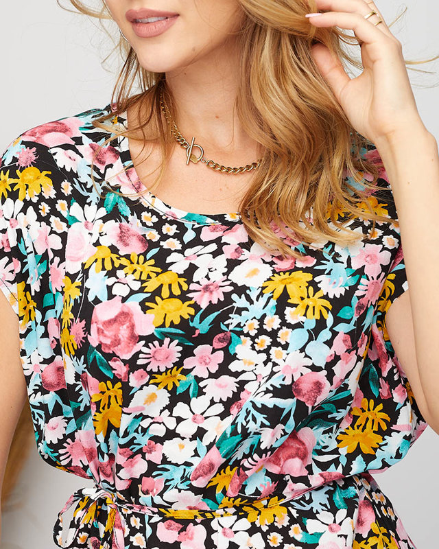 Dámské černé květované rovné šaty se zavazováním v pase - Oblečení