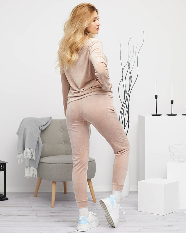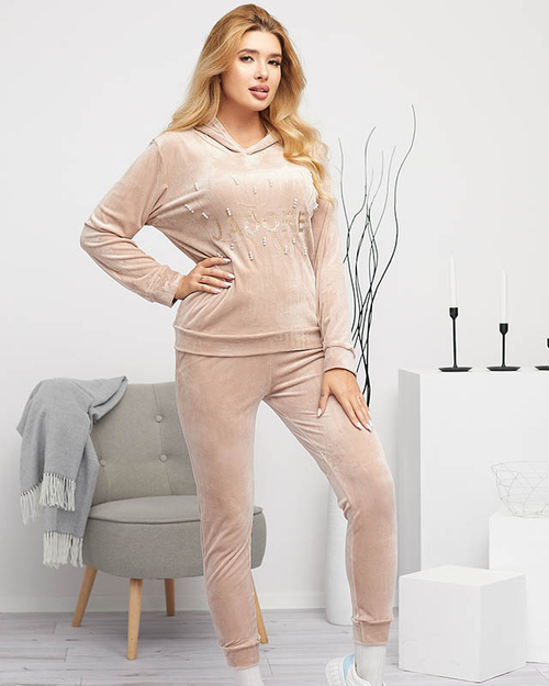 Béžová dámská tepláková souprava s potiskem a perličkami - Oblečení