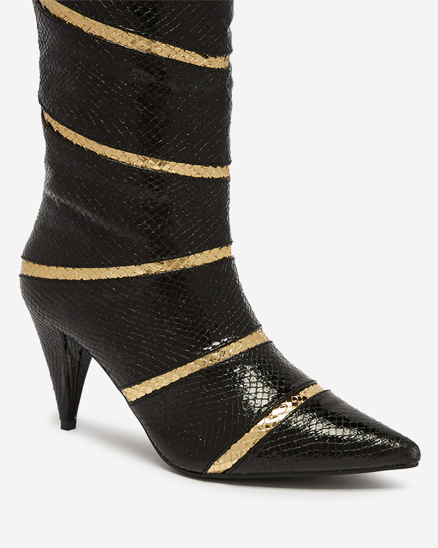 Černo-zlaté dámské kozačky na jehlovém podpatku s reliéfními proužky Felifea- Obuv