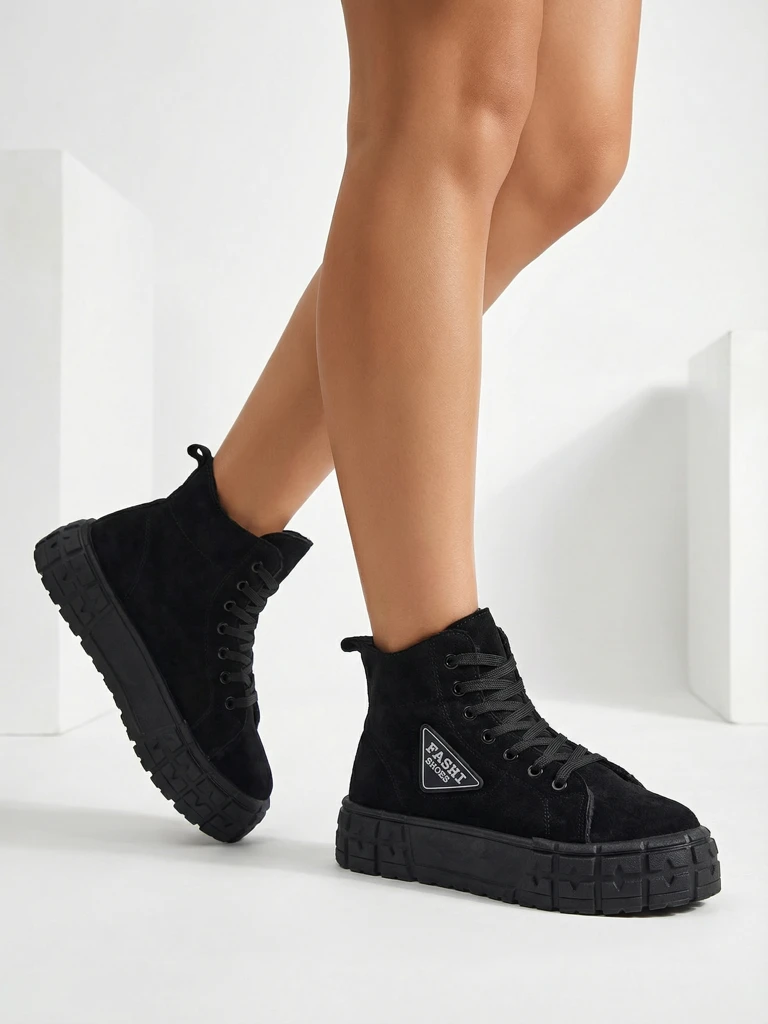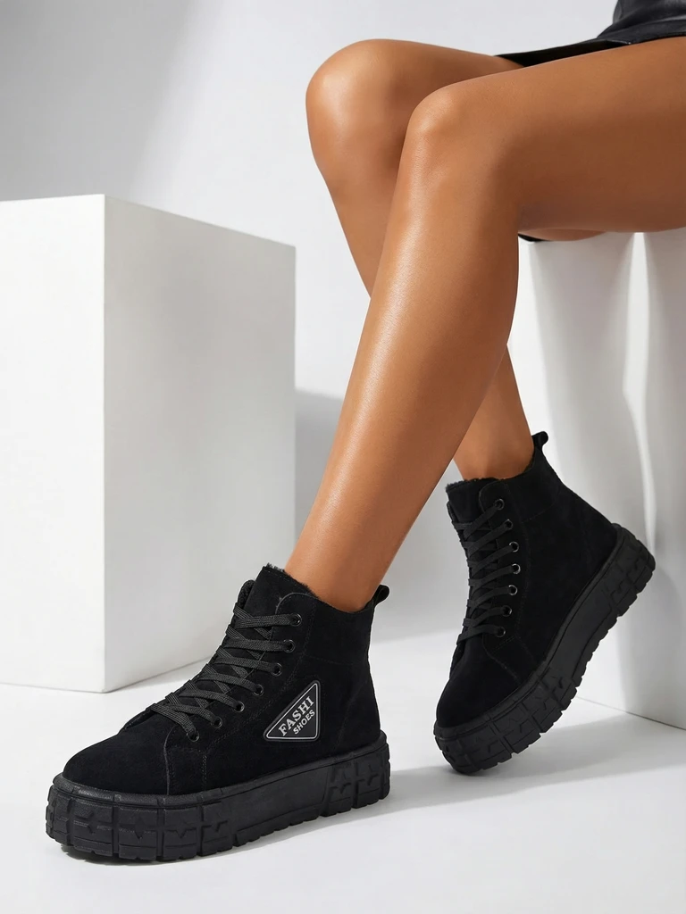 - Super stylové dámské kotníkové boty na masivní platformě, vyrobené z eko-semišové kůže. Model je šněrovací, vnitřek je zateplený kožešinou. Svršek je zdobený nášivkou s nápisem. Ideální pár pro každý den! ČERNÉ ZATEPLENÉ BOTY KOTNÍKOVÉ BOTY ZEFIRA