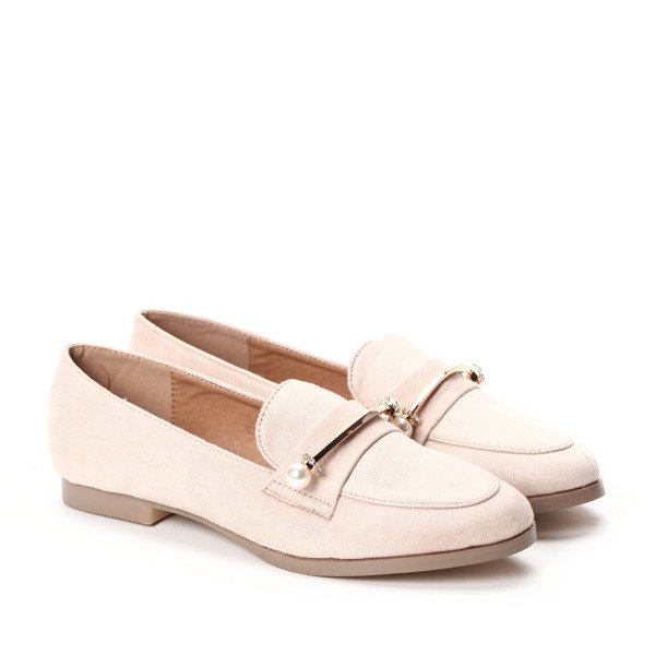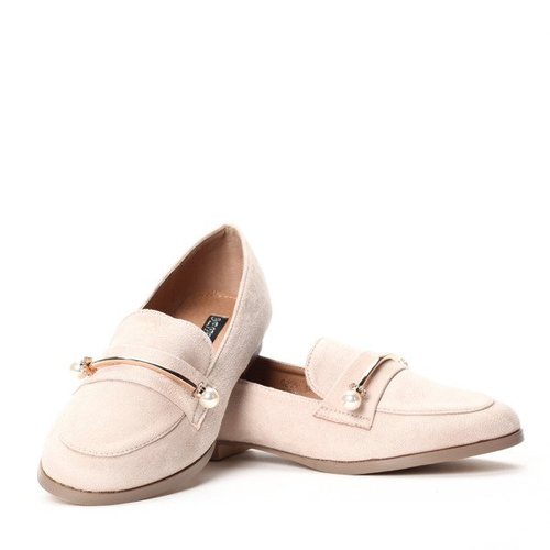 - Śliczne mokasyny wykonane z miękkiego w dotyku ekologicznego zamszu. Na cholewce złota ozdoba. Delikatny, płaski obcas. Idealne do modnych stylizacji.