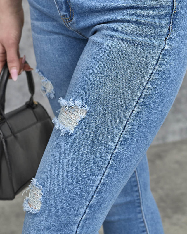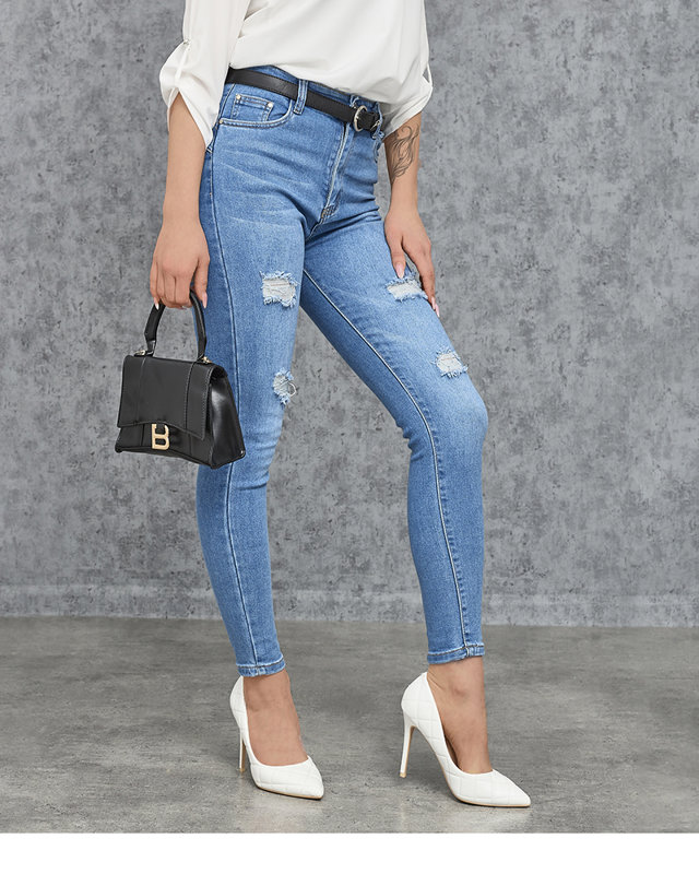 - Dámské džínové kalhoty ve tvaru trubky, vyrobené z bavlněné tkaniny s odřením. Model s vysokým pasem a zapínáním na knoflík a zip. Dva páry kapes - vzadu a vpředu. POZNÁMKA: Přesnost měření (+/-) 1 cm.