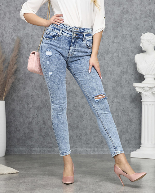 - Džíny z bavlněné tkaniny s oděrkami. Model s vysokým pasem, zapínání na knoflíky a zip. Dva páry kapes - vzadu a vpředu. POZNÁMKA: Přesnost měření (+/-) 1 cm.