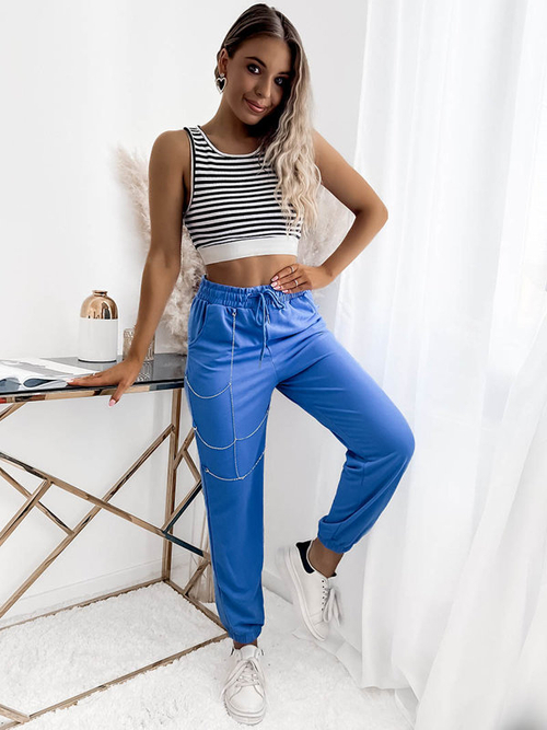 - Dámské látkové tepláky z příjemného materiálu. Nohavice jsou zakončené gumou, v pase je guma a vázačky a na bocích jsou kapsy. Navíc řetízek, který lze zavěsit na bok. POZNÁMKA: Přesnost měření (+/-) 1 cm.