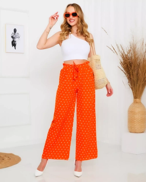 - Široké látkové kalhoty s širokými nohavicemi. Model je vyrobený z lehké a vzdušné látky, má pružný pas a na bocích pásky na zavazování. Kalhoty zdobí potisk v hráškovém provedení. Perfektní na léto! POZNÁMKA: Přesnost měření (+/-) 1 cm.