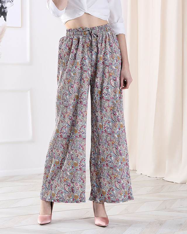 - Široké látkové kalhoty se širokými nohavicemi. Model je vyrobený z lehké a vzdušné látky a v pase má pružný pás a nohavice. Kalhoty zdobí barevný potisk. Perfektní na léto! POZNÁMKA: Přesnost měření (+/-) 1 cm.