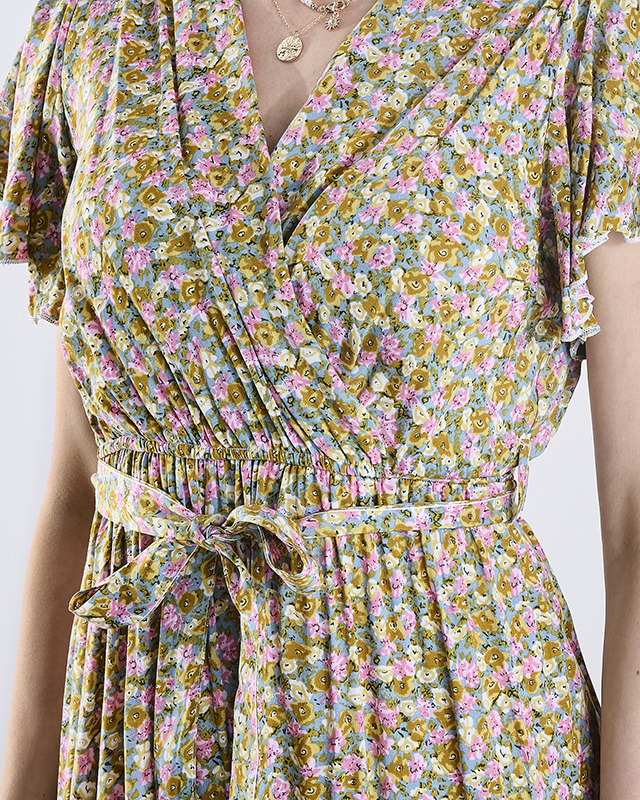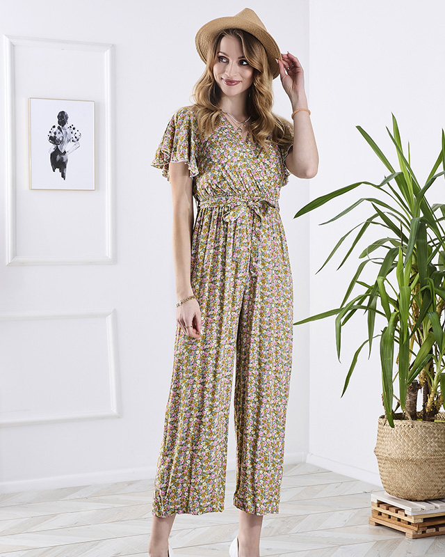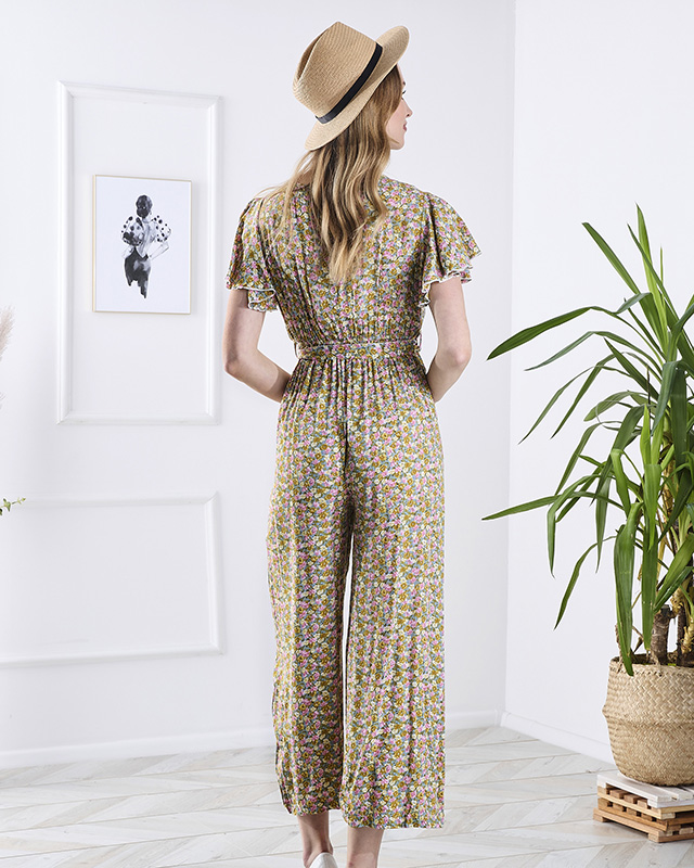 - Módní dámský overal z bavlněné látky s květinovým vzorem. Výrobek s obálkovým výstřihem a krátkými rukávy. Model má zapínání na knoflíky na zádech a široké, dlouhé nohavice. POZNÁMKA: Přesnost měření (+/-) 1 cm.