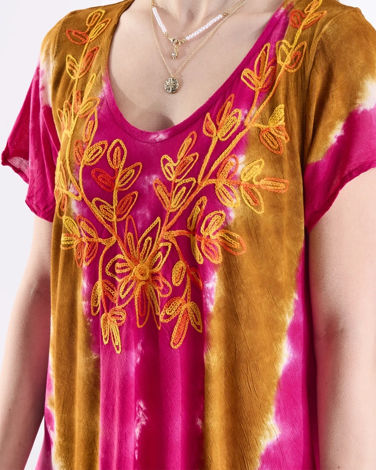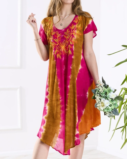 - Barevné dámské plážové šaty typu narzutka, vyrobené z měkké a vzdušné látky, zdobené vyšívanými vzory. Model má kulatý výstřih, krátké rukávy a rozšířený spodní lem. Skvělý doplněk na dovolenou! POZNÁMKA: Přesnost měření (+/-) 1 cm.