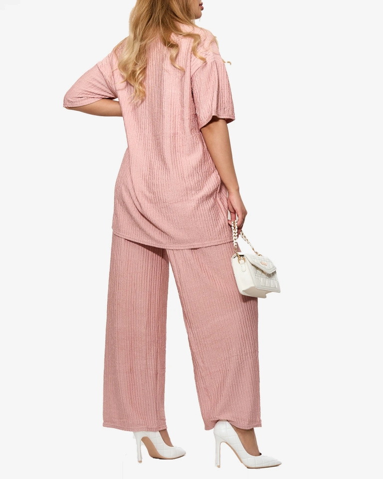 - Dámský komplet z elastické žebrované látky. Halenka s krátkými rukávy a kulatým výstřihem. Dlouhé palazzo kalhoty s vysokým pasem, gumou a zavazováním v pase. Stylová a pohodlná kombinace! POZNÁMKA: Přesnost měření (+/-) 1 cm.
