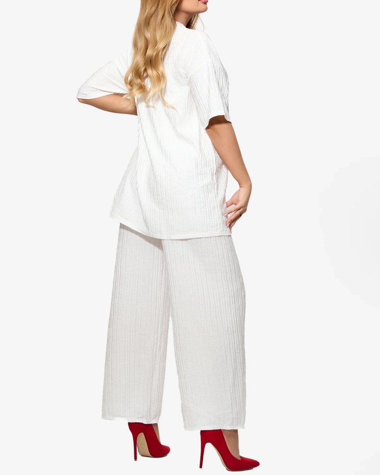 • Dámský komplet z elastické žebrované látky. Halenka s krátkými rukávy a kulatým výstřihem. Dlouhé palazzo kalhoty s vysokým pasem, gumou a zavazováním v pase. Stylová a pohodlná kombinace! POZNÁMKA: Přesnost měření (+/-) 1 cm.
