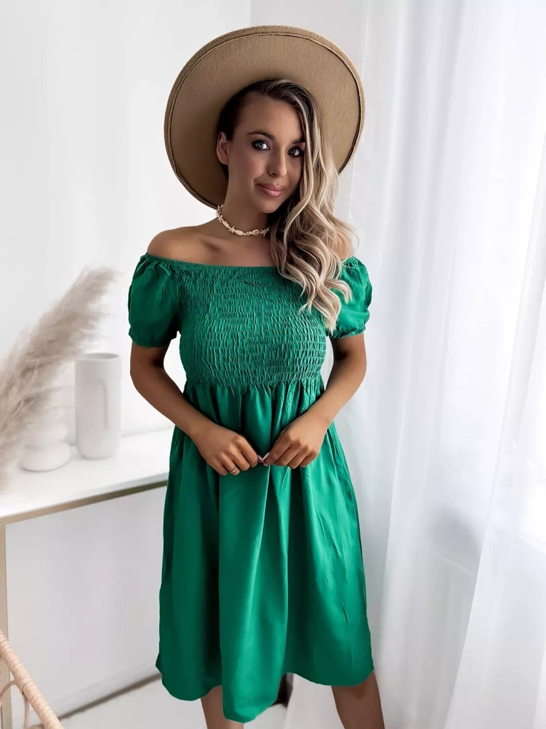 - Jemné dámské mini šaty z viskózové tkaniny. Model s výstřihem typu hiszpana s gumou na ramenou a v pase. Šaty mají krátké rukávy. Ideální na dovolenou! POZNÁMKA: Přesnost měření (+/-) 1 cm.