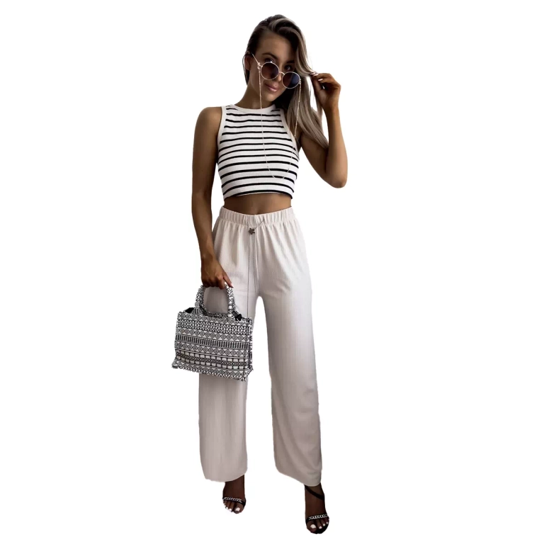 - Lehké dámské široké kalhoty z žebrovaného materiálu. Výrobek má pružný pas a nohavice, které dokonale zvýrazní pas. Must have této sezóny! POZNÁMKA: Přesnost měření (+/-) 1 cm.